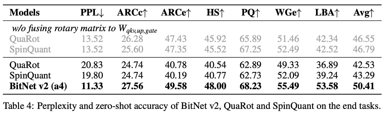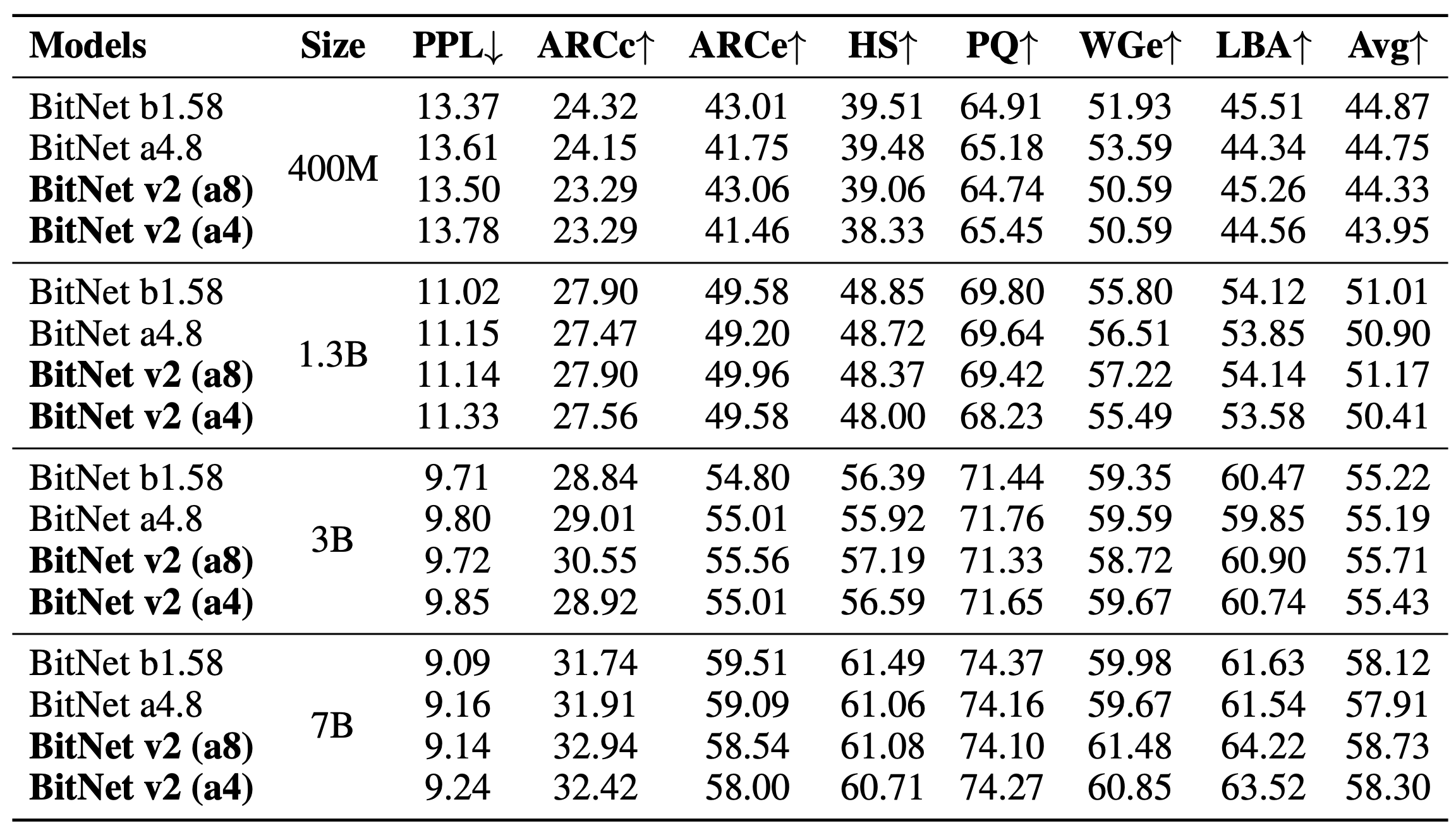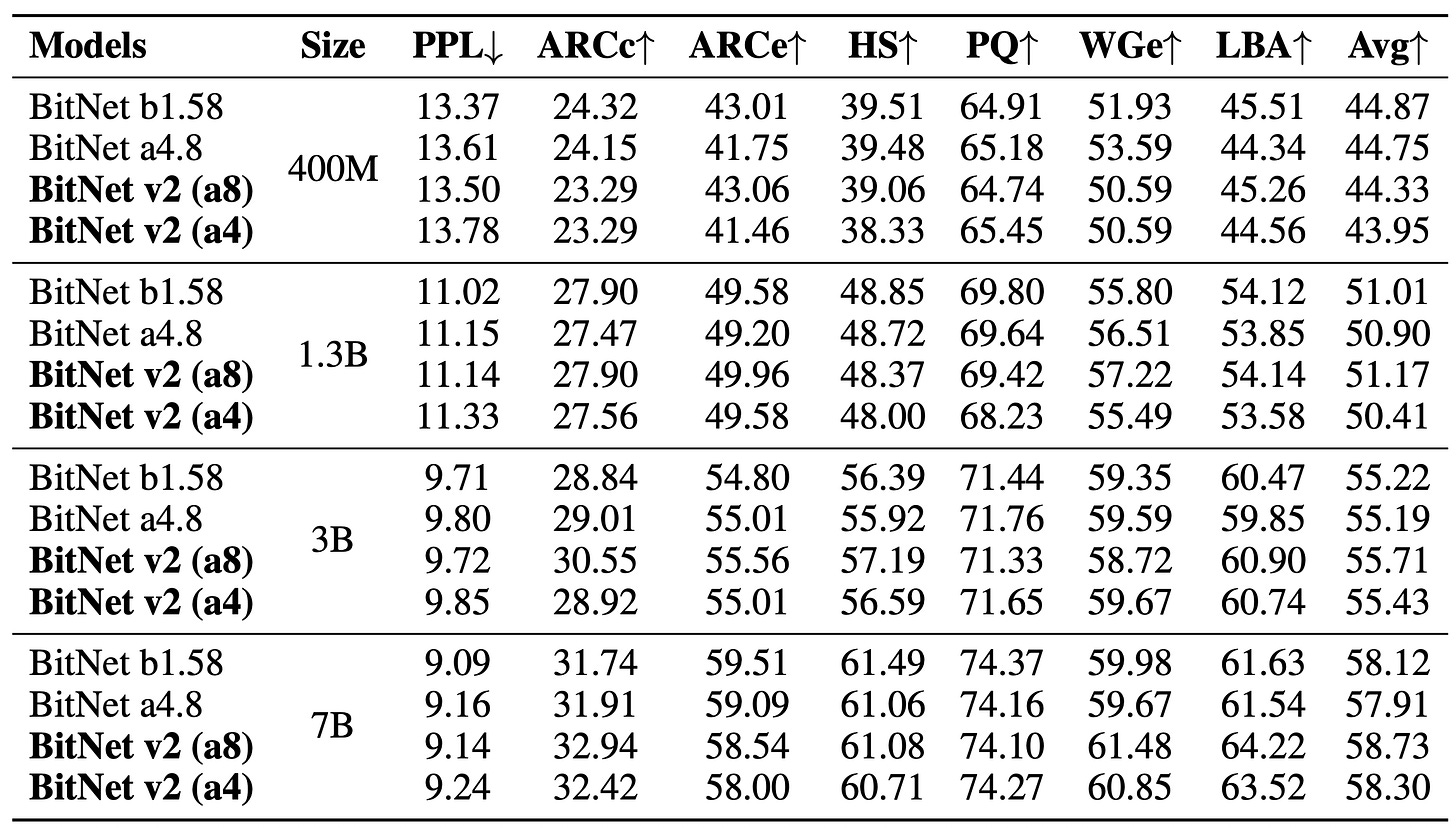 BitNet v2 achieves PPL: 11.33, Avg Accuracy: 50.41%