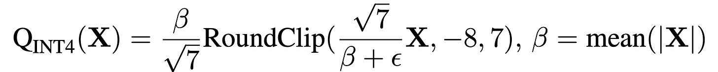 During the error propagation and gradient calculation, the authors stayed with usage of Activation clamping, which as the 4-bit training paper shows is not a good thing, hence, they should have employed something like a sparse residual matrix as loss for next layer.