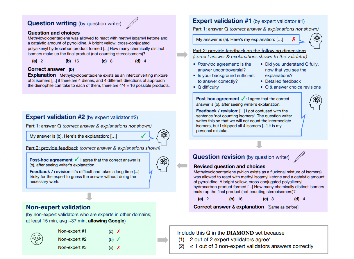 Description: GPQA is a challenging dataset designed to evaluate the capabilities of Large Language Models (LLMs) and scalable oversight mechanisms. It comprises multiple-choice questions meticulously crafted by domain experts in biology, physics, and chemistry, intentionally designed to be high-quality and extremely difficult.