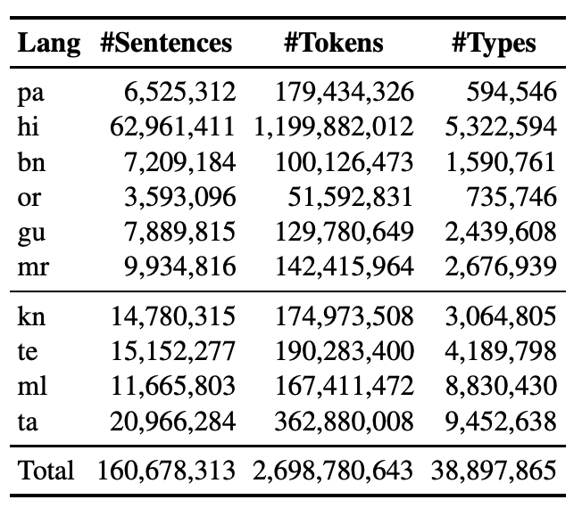 Number of Datapoints: The corpus contains approximately 2.7 billion words across 10 Indian languages from two language families.