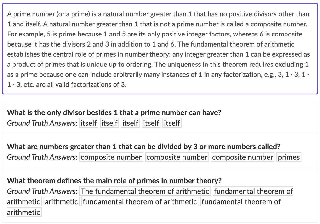 Description: SQuAD is a reading comprehension dataset where models are tasked with answering questions based on given passages from Wikipedia articles. The answers are typically spans of text extracted directly from the passages.