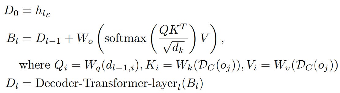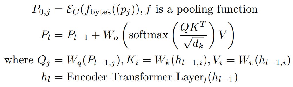 The initial byte-representations for the cross-attention are initialized as the byte embeddings from the last encoder layer i.e. hlE . The subsequent byte-representations for layer l, dl,i are computed as per above equation. The result of this block is unpatched sequence / byte level representation which is then projected out for next-byte prediction.
