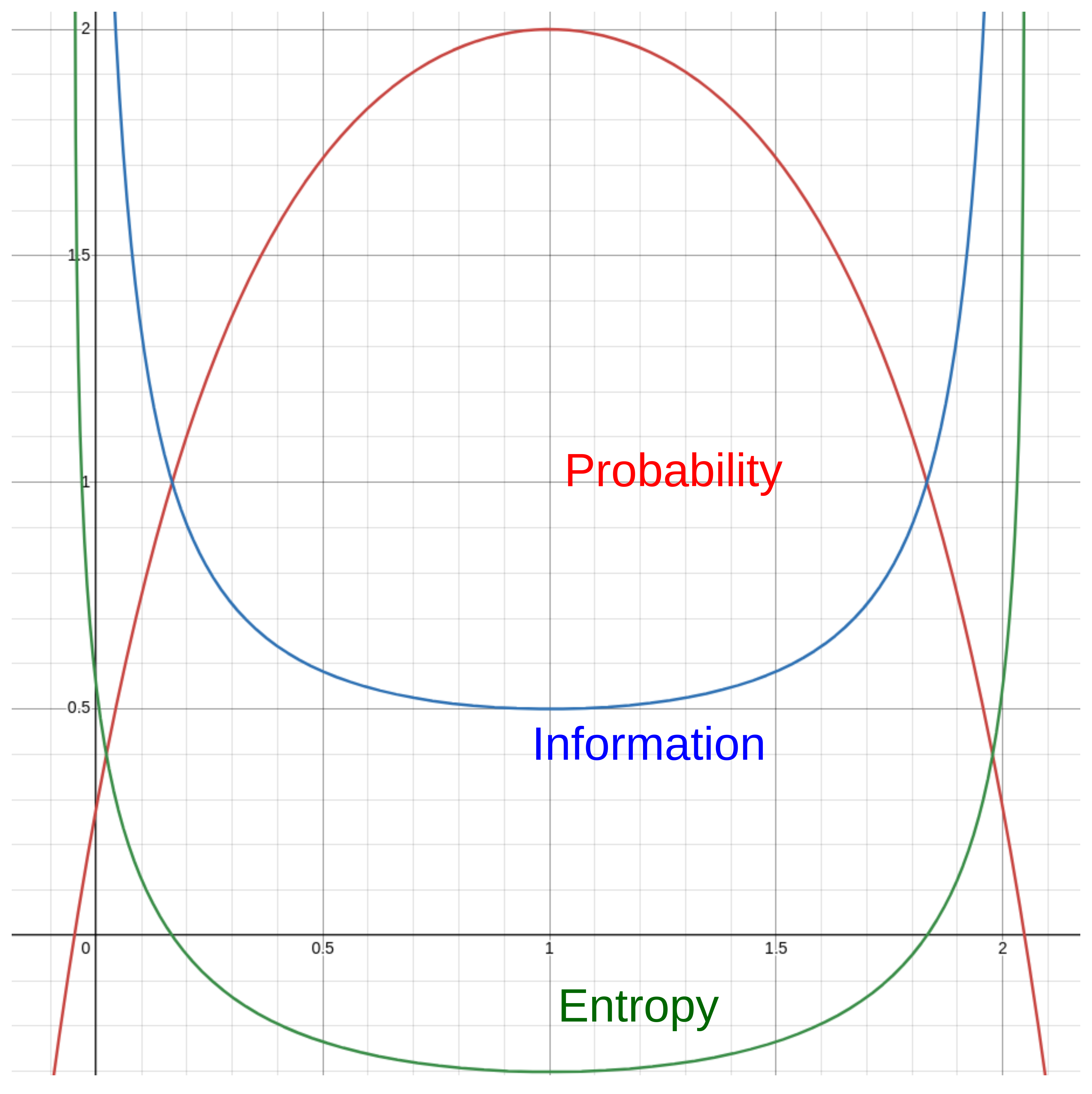 We won’t discuss definitions here, but, quite simply probability (P) and information (I) are inversely proportional to each other and entropy (E)is just log(information)which is a measure of how spread out things are or simply randomness (much deeper rabbit hole, but let’s just move on). Less probable events have much higher information attached to it, for example, probability of seeing an alien civilization is pretty low, but if we come in contact to one, our understanding of life itself would change, which inherently would increase our knowledge and hence increase the entropy of thoughts (possibility increased!!); also you can read about black swan events2.