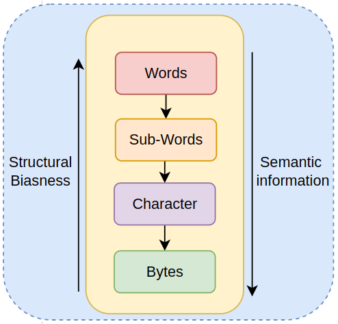 Based on the above post, we can conclude that tokenization is an undesired dependency that has to be in place for effective communication between machine and us. But, there is an evident trade-off between structural biasness vs semantic information (entity-entity relations) as shown in below diagram.