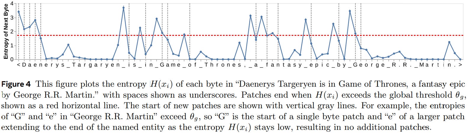 Dynamic patching : These bytes are then patched/joined together using the entropy criteria we discussed. Simply put, any sequence of bytes with low entropy are patched together, as soon as a high entropy byte is met, the previous sequence ends, and the high entropy byte becomes the new sequence. Using this process they makes multiple patches of low and high entropy bytes (basically array of variable length arrays). But, how do they compute entropy for each byte? They simply train a byte-level auto-regressive model (let's call this entropy model) and compute probability of next byte given previous byte, this probability gives us entropy (as we already discussed above). But, how do they decide when to call a byte high entropic?
