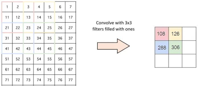 A stride of 2 means sliding the filter two pixels to the right after each calculation. A stride of 3 means sliding it three pixels.
