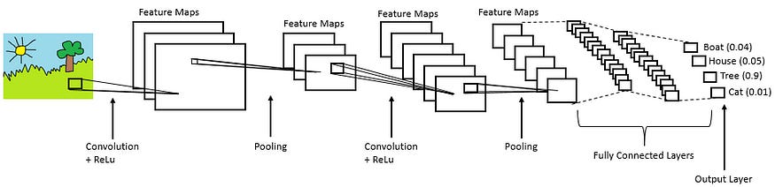 SOFTMAX: The very last layer uses a Softmax function to produce the final output: a set of probabilities for each possible class. In our example, it might correctly output Tree: 0.9.