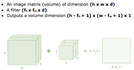 This diagram perfectly summarizes the math. Notice how the input depth d and the filter depth d must match, and the output depth is always 1 (for one filter).