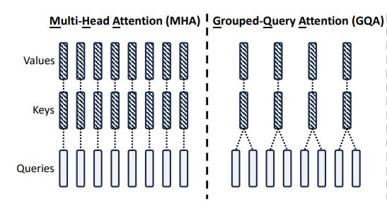 For example, our 32 query heads might be split into 4 groups of 8. Each group of 8 queries would then share one K/V head.