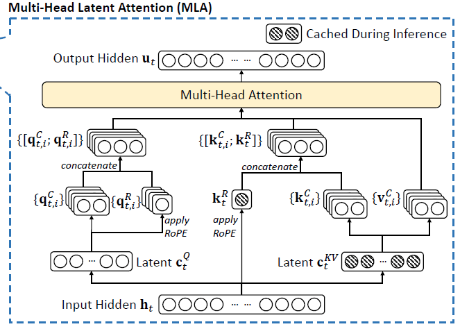 This entire, elegant dance of matrices compressing the input into tiny latent sketches and then reconstructing them just in time for the attention calculation—is the core mechanism of Multi-Head Latent Attention. It solves the KV Cache memory problem at its source, not by compromising on the number of attention heads, but by being smarter about what information it chooses to remember.