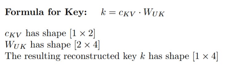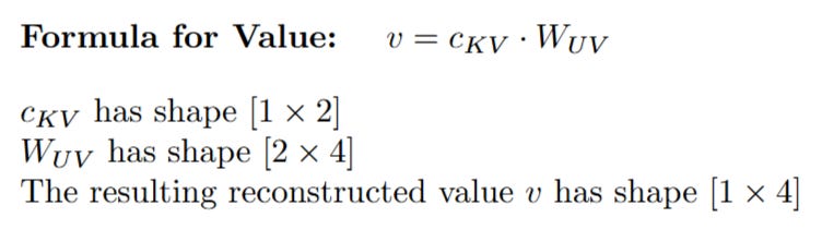 Notice how the tiny 2-dimensional sketch c_KV was able to generate both a 4-dimensional Key and a 4-dimensional Value. Because W_UK and W_UV have different learned weights, they can interpret the compressed information in c_KV differently, extracting the necessary aspects for "what I have" (the Key) and "what I will give" (the Value).