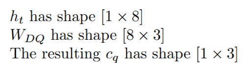 The matrix multiplication effectively compresses the 8-dimensional input into a much smaller 3-dimensional latent representation for the query. This c_q is a temporary variable used to reconstruct the final query.