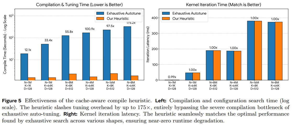 Heuristic vs. Exhaustive: In massive shapes (N=8M, K=64K), exhaustive tuning takes over 325 seconds to find an optimal configuration. The cache-aware compile heuristic analytically derives a near-perfect configuration in less than 2.5 seconds.