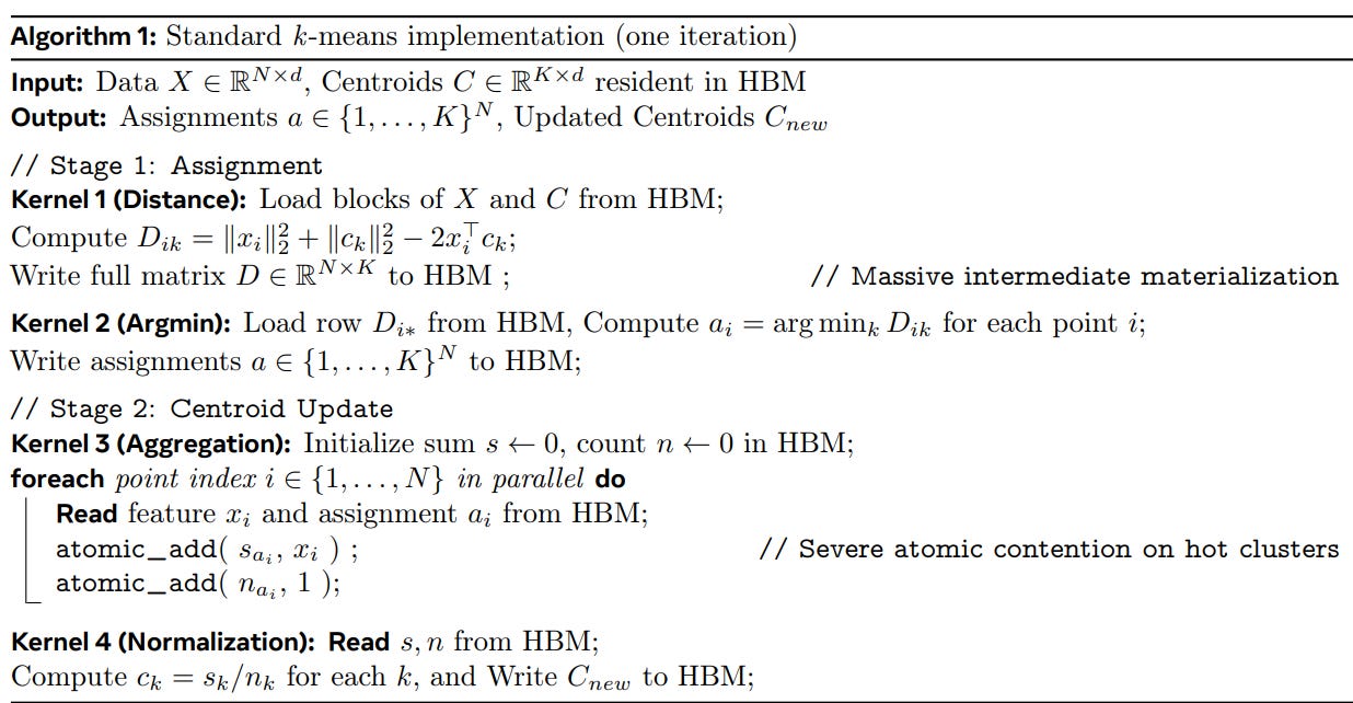 Data Materialization: In standard implementations, the GPU materializes (writes to global memory) a large assignment vector to track which point belongs to which cluster.