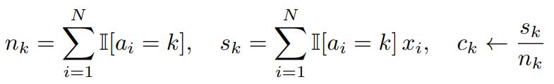 sorted_idxviaargsort(a)and construct sorted cluster IDs.Initialize: Set centroid sums (s) and counts (n) to zero.