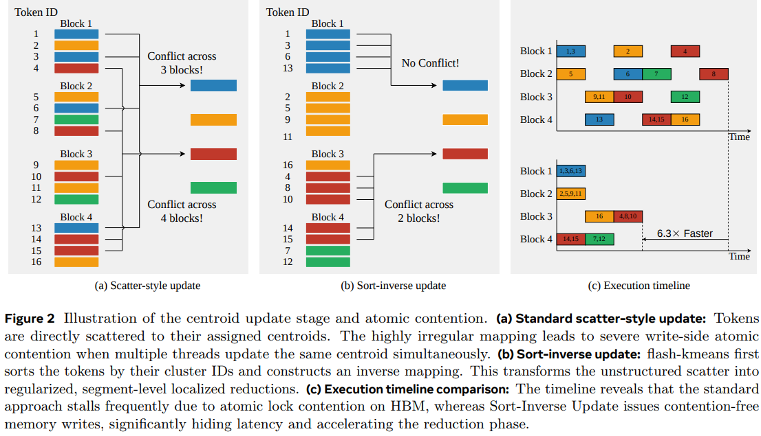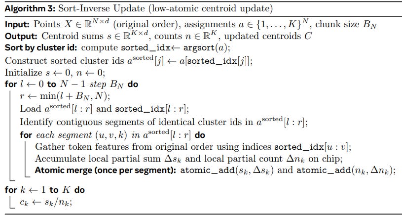 I find the move from “scatter-style” updates to “cluster-to-token gather” particularly brilliant. Instead of fighting hardware-level atomic contention in parallel programming the authors restructured the logic to align with the silicon’s physical strengths.