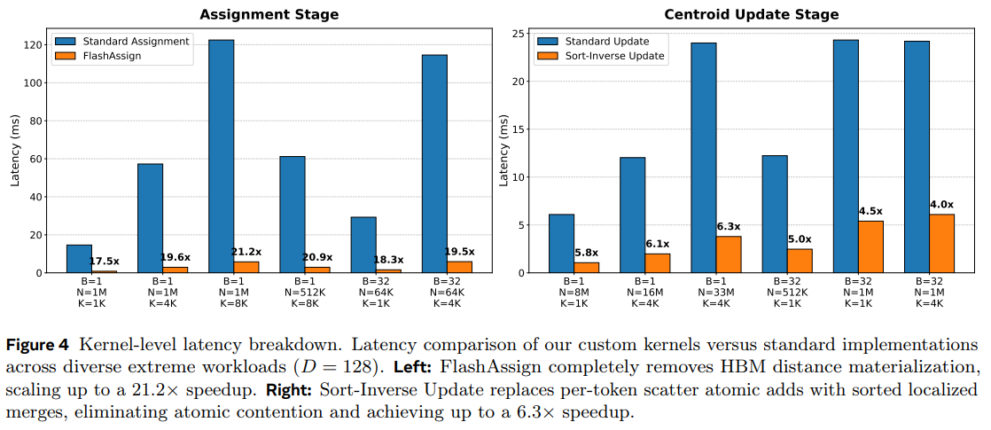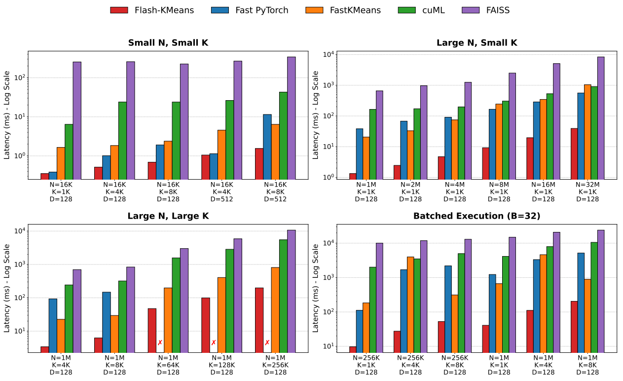 Large N with Large K (Memory-Intensive): This is the “OOM” (Out-Of-Memory) danger zone. For a workload of N=1 M, K=64K, standard PyTorch implementations fail entirely as they attempt to materialize the massive distance matrix. Flash-KMeans, however, achieves its most dominant absolute speedup here, outperforming the best alternative (fastkmeans) by over 5.4×.