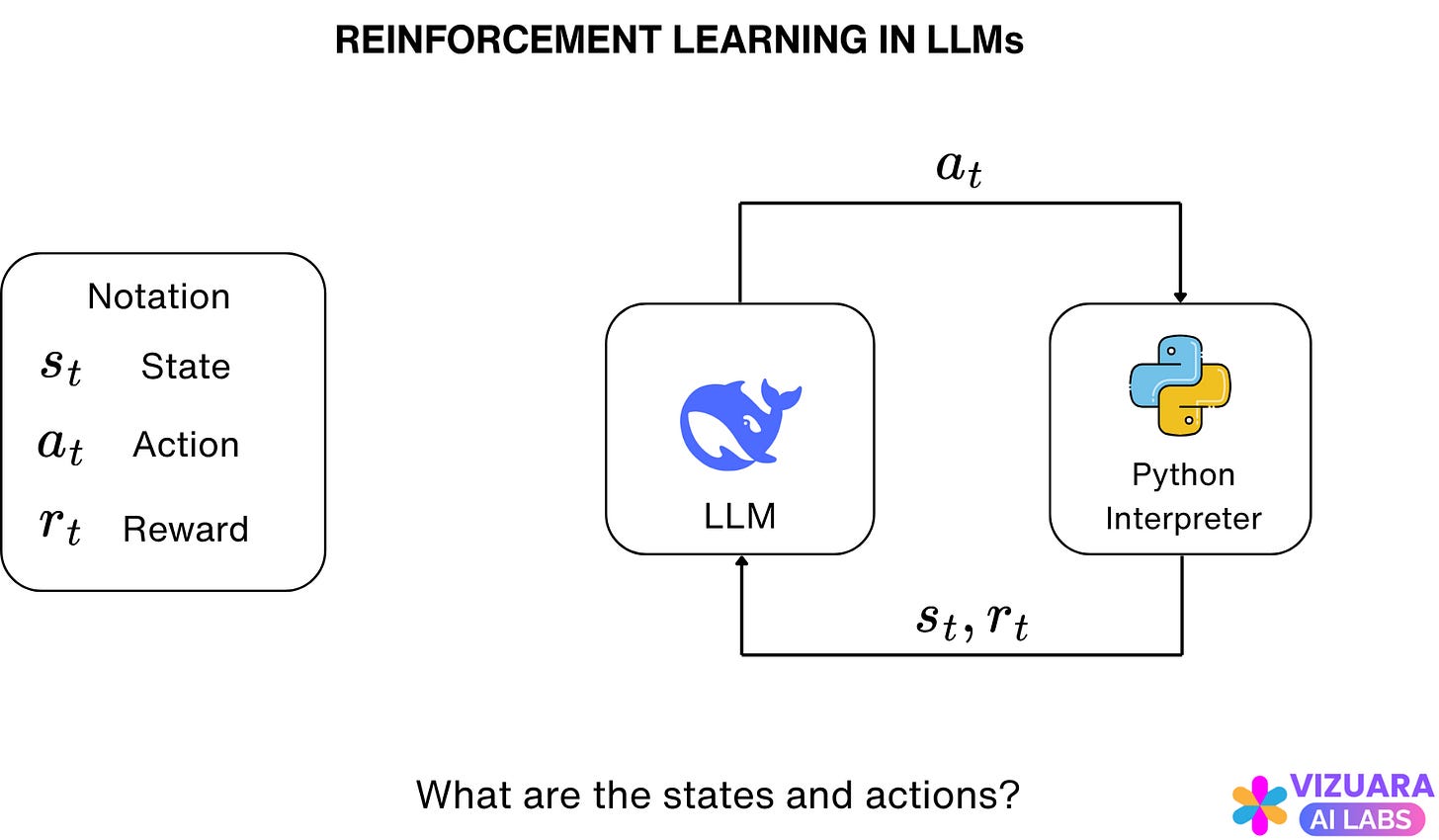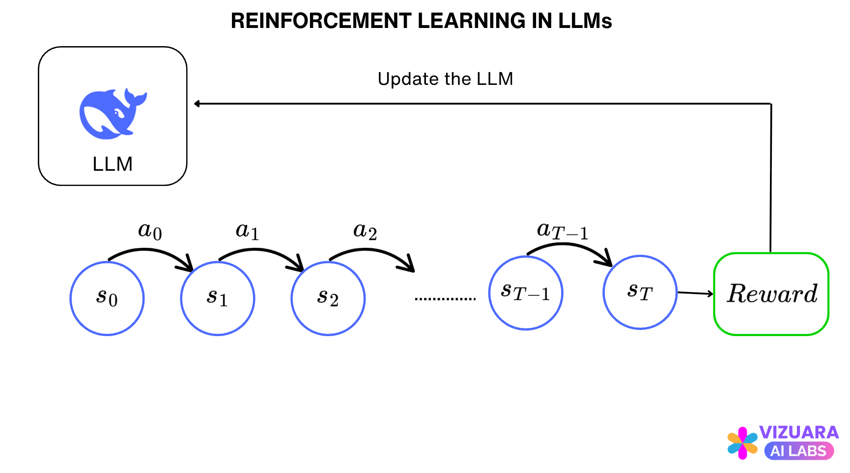 What if we think of the LLM as the agent and the next word prediction as the action taken by this agent? So, the states would be the prompt given by the user and the previous set of words predicted by the LLM.