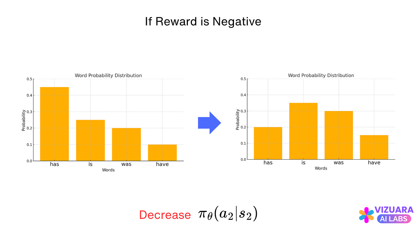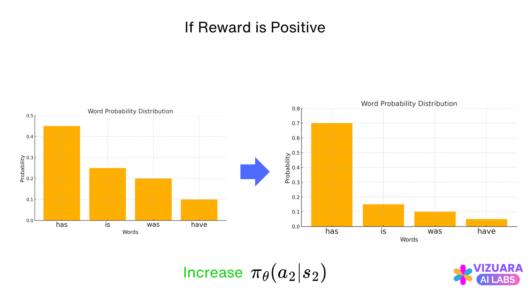And then picks the action with the highest probability, “has” in this case. Now if the reward is positive, the action is reinforced, else it is penalized.
