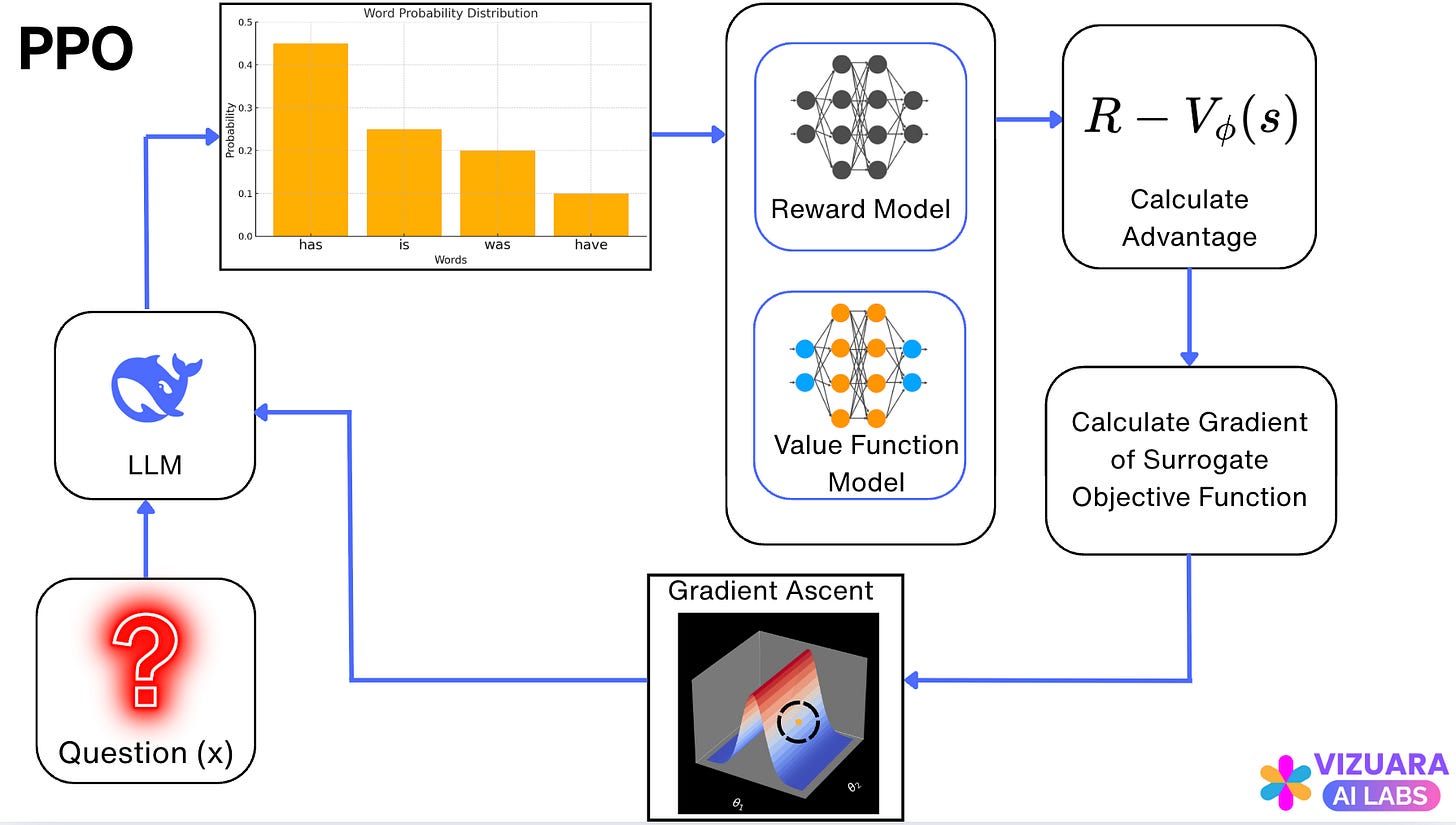 Before GRPO came out, the popular algorithm was Proximal Policy Optimization (PPO). Now, PPO relied on two models to estimate the advantage - (1) Reward Model to estimate the rewards and (2) Value Function Model.