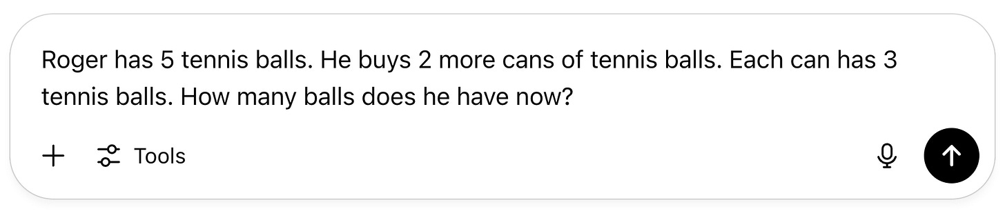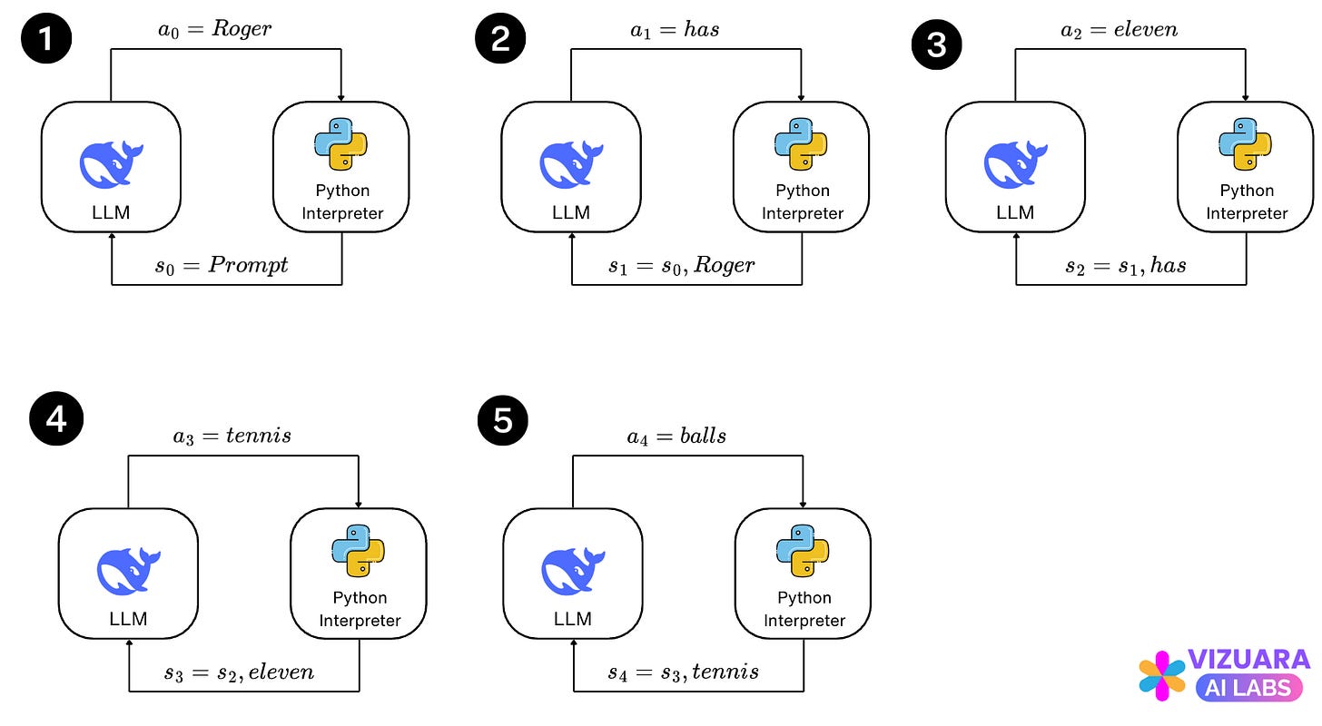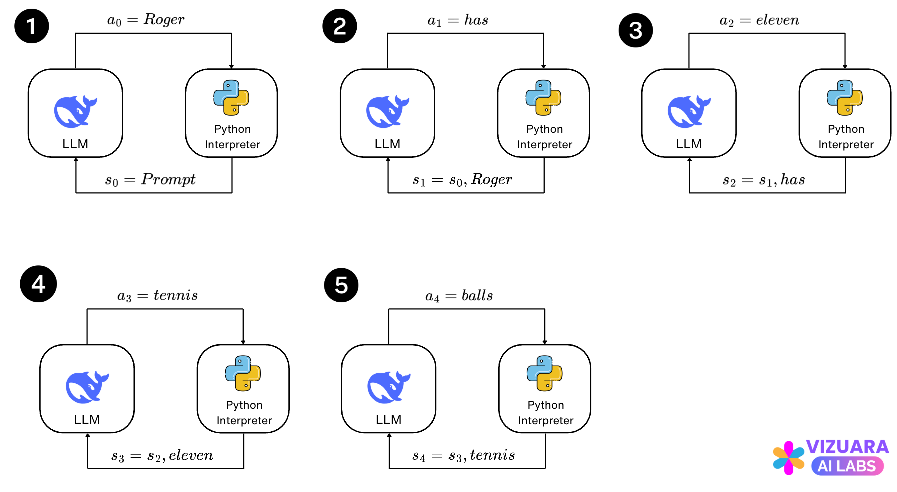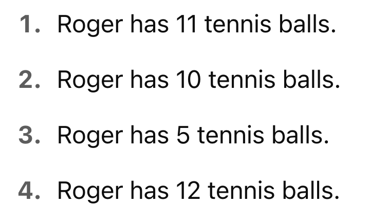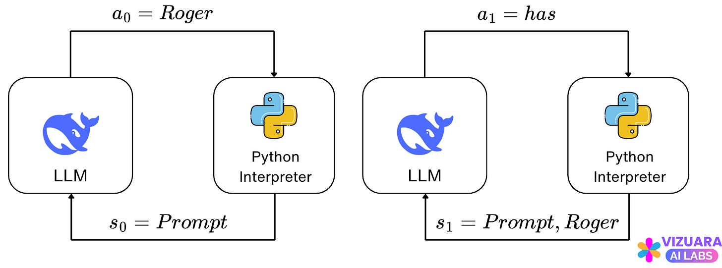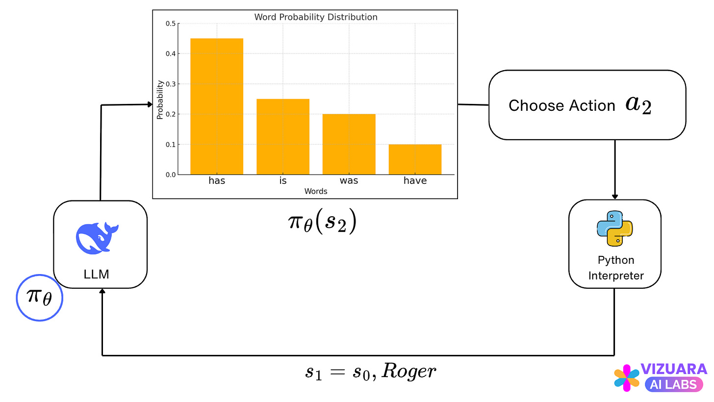 Consider the above example of “Roger has 5 tennis balls..”. If the LLM has generated the word “Roger” already and is considering choosing the next action, it creates a probability distribution for all actions.