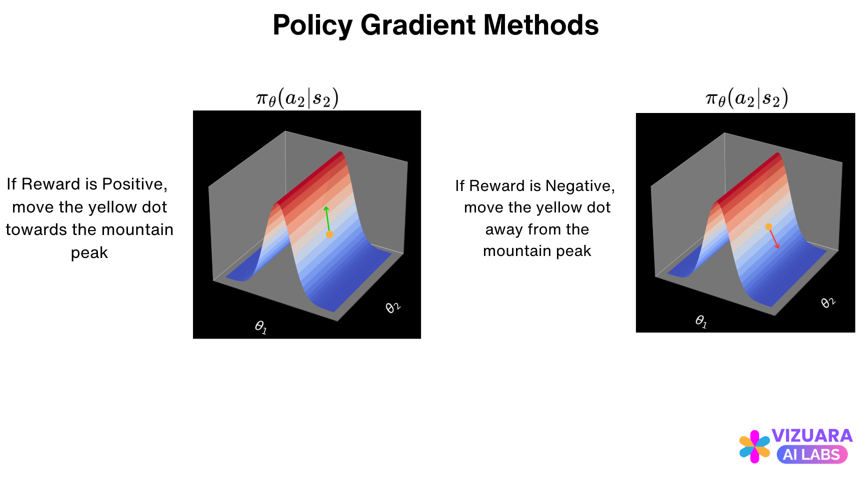Methods which do this are called as Policy Gradient Methods. They tell us how to change our policy (the LLM) such that actions which receive positive rewards are reinforced and actions which receive negative rewards are penalized.