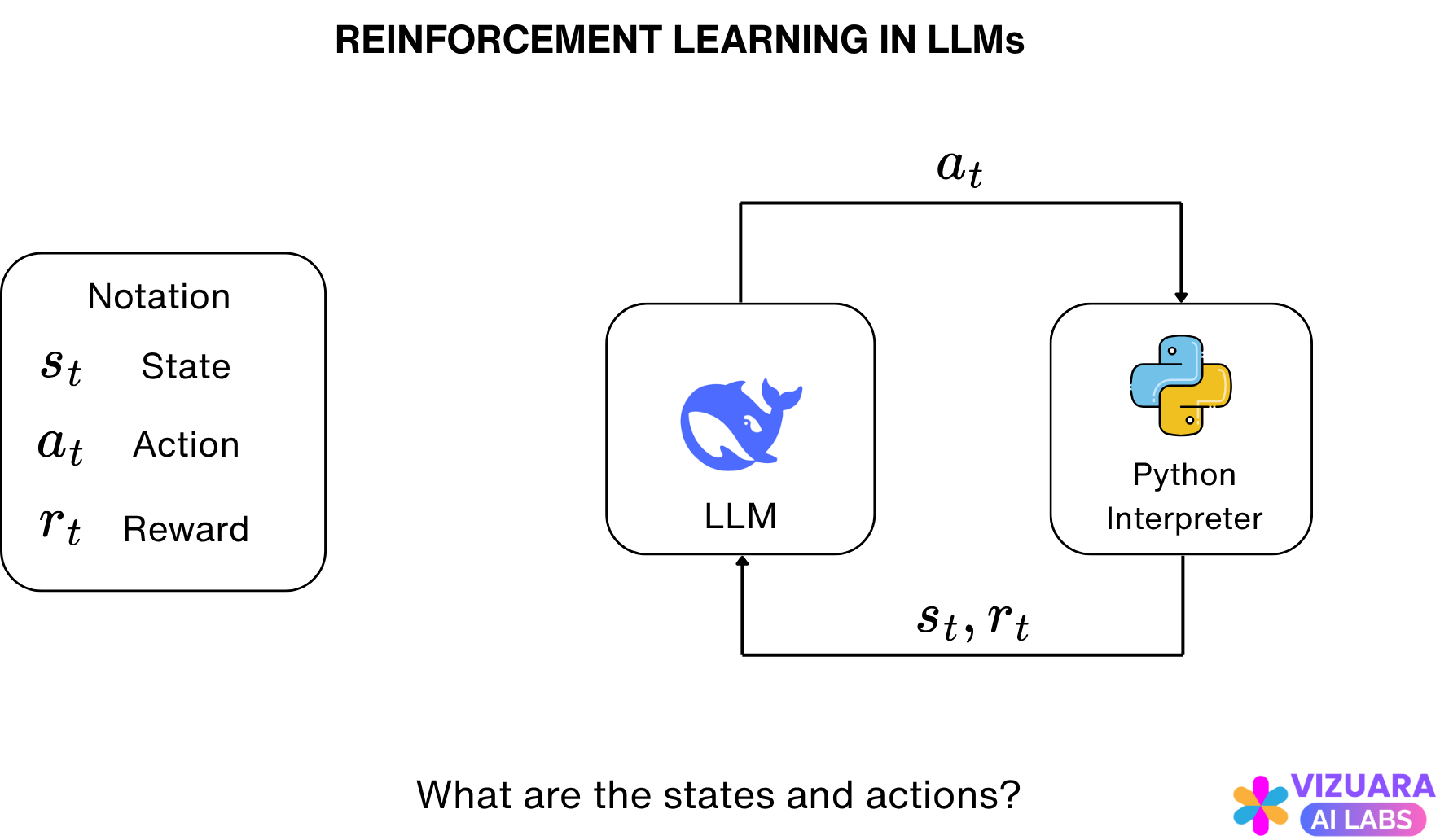 The action is the next word predicted by the LLM and the state is the combination of the user prompt and the previous words predicted by the LLM.