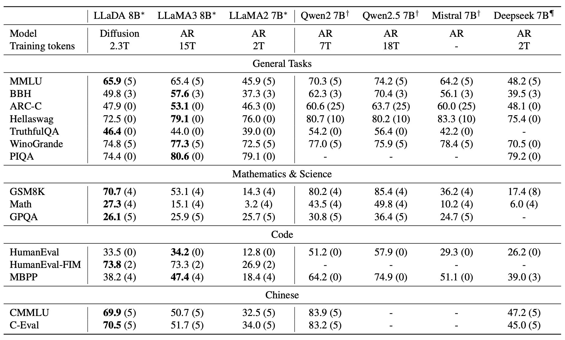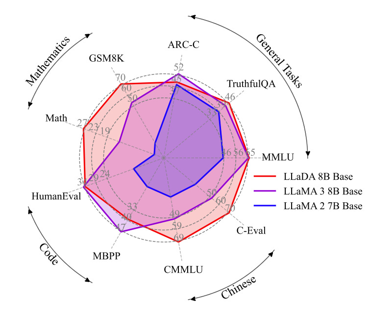 Llada-8B beats llama2 on multiple benchmarks, and plays on par against Llama3. For understanding the below mentioned benchmarks, visit here.