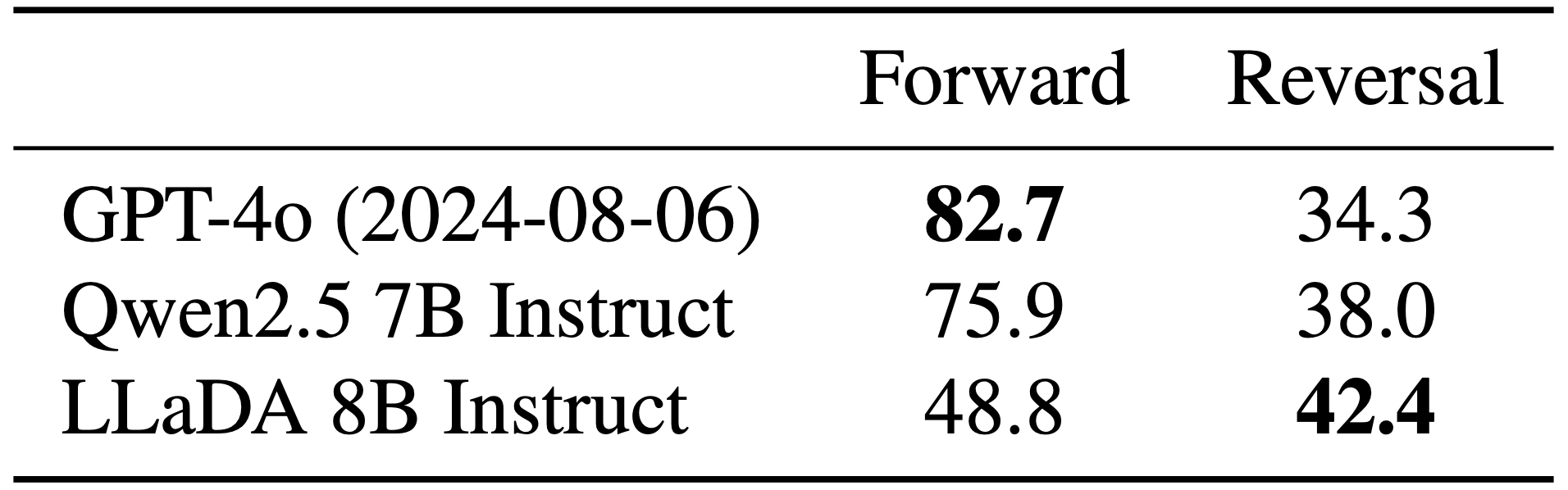 Architectural biasness : This in my understanding is the most significant issue, the current AR models suffer from lack of reversal reasoning as they perform look-back generation as they are uni-directional (similar to early version of uni-directional LSTMs). Hence, any task where reverse context is required (example writing poem backwards or answering some reasoning questions), even the larger SOTA models like GPT4-o, gemini suffer heavily. Hence, if we want a transcend to a truly reasoning capable system, bidirectional understanding is very important.