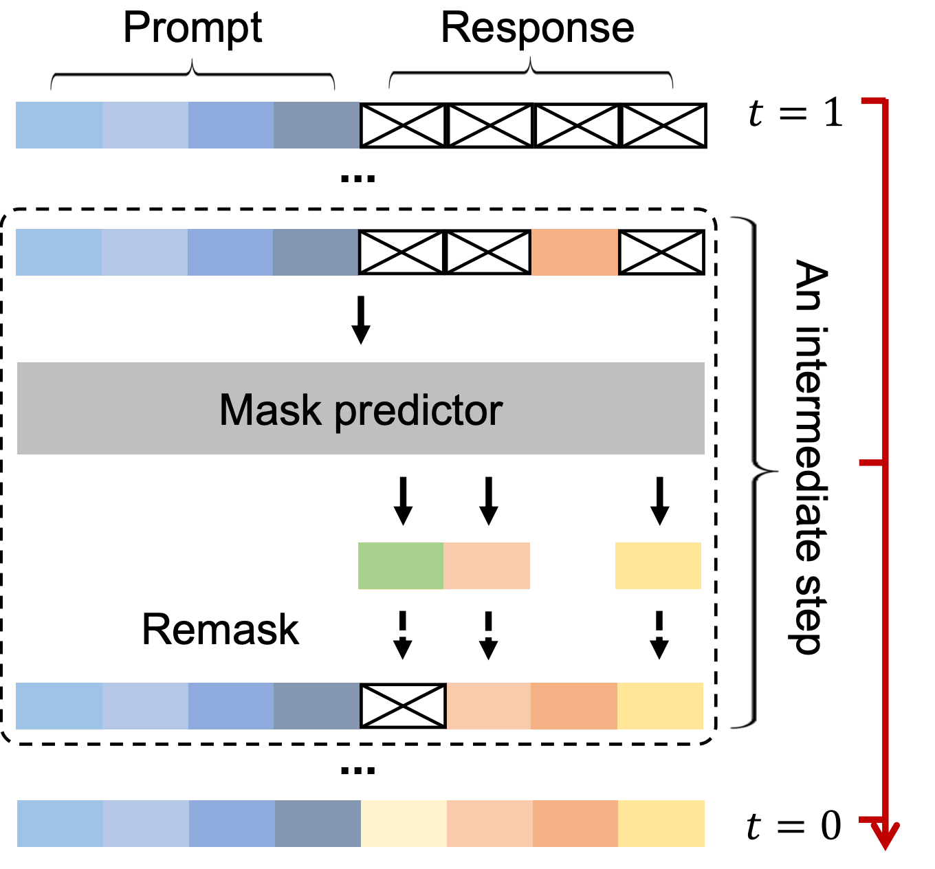 The instructions/prompt and N number of mask tokens are concatenated together (presumably N=4096), which is then passed to model for reverse diffusion/denoising.